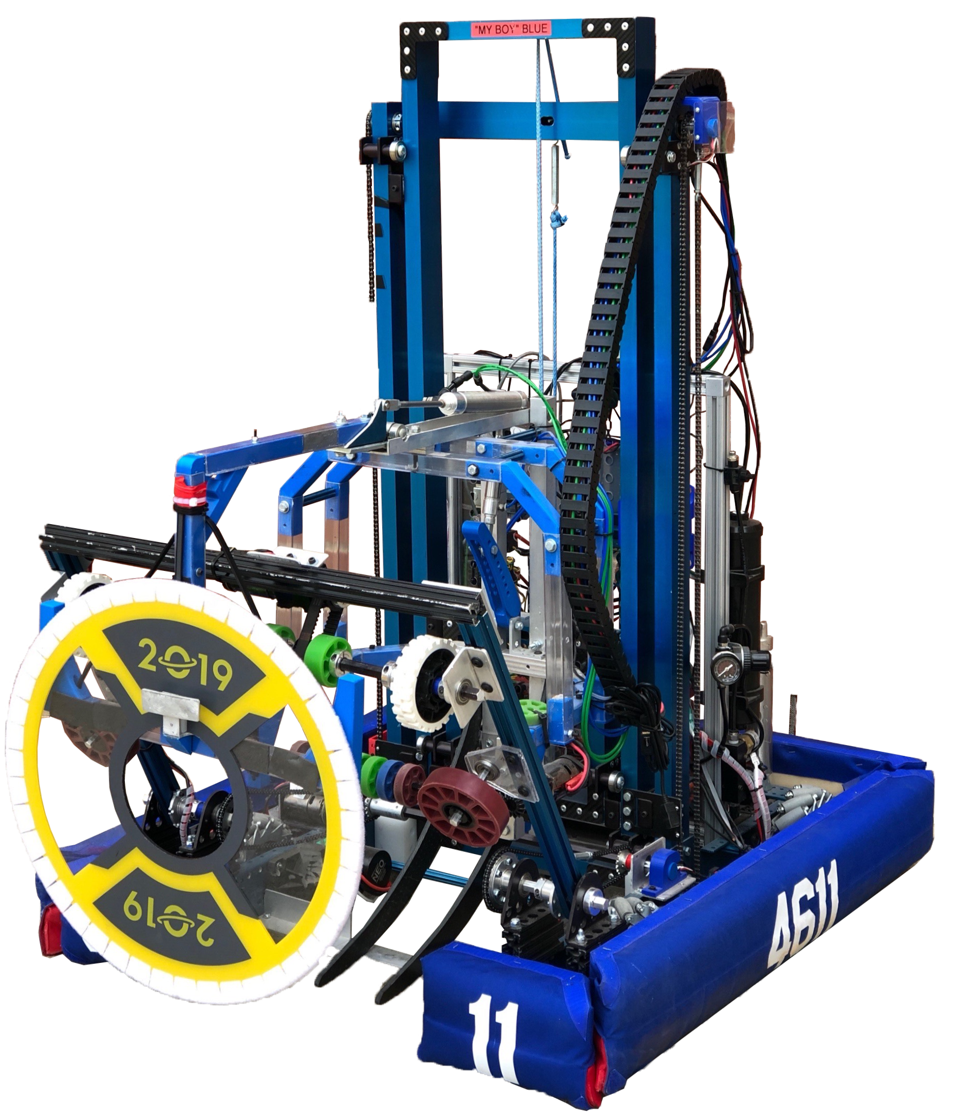 From the competition Destination: Deep Space, Blue was developed with the goal saving our “hatch panels” (discs) and “cargo” (foam balls) from the sweeping sandstorm. In the beginning of the match, the shutters lowered; blocking the drivers view. We put a camera on Blue to maneuver the robot off the platform. After 15 seconds, our robot drives around the field in search of “hatch panels” and “cargo” to load into the rockets and cargo ships. Our driver would install the hatch panels with Velcro strips onto the rockets and cargo ships . Blue used a hook to pull the panel off of the wall and onto the space ships. For the cargo, the robot used the tusks as an intake for the ball and could be lowered in the space ship or loaded in the higher goals using the elevator for more points.
