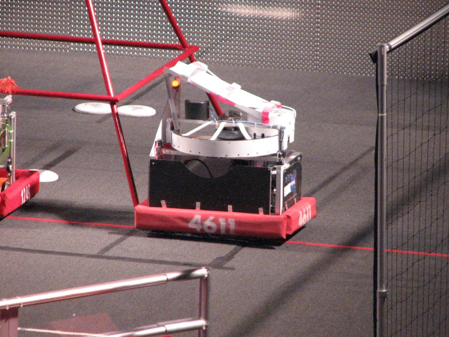 Competitors are challenged with the task of shooting frisbees into the goals and the climbing of a 3 level pyramid. 4611’s first season was a time of growth and learning. The team’s fabricators made quick progress and had the final Frisbee shooter complete by the second Saturday. Clocking in at 40.9 mph, this powerful shooter was also accurate. A hopper system and aiming mechanism followed shortly. The team was making great progress, even after their Xbox 360 Kinect Sensor failed mid competition, they pushed through and competed greatly without computer vision.